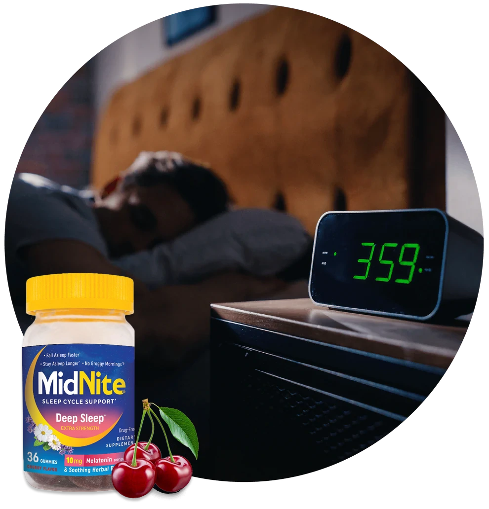 Fall asleep faster and stay asleep longer with MidNite Deep Sleep! A drug-free dietary supplement, MidNite Deep Sleep Extra Strength sleep aid is for adults 18 and over who suffer from occasional sleeplessness. Soothing and effective, it contains 10 mg of melatonin to help activate your natural sleep-wake cycle, chamomile to calm and promote restful sleep, and lavender to encourage a relaxing sleep. MidNite Deep Sleep Extra Strength gummies provide an initial dose of melatonin to help you fall asleep fast, then slowly release additional melatonin throughout the night to help you stay asleep longer. Non-habit forming, MidNight Extended Release is drug-free, gluten-free, lactose-free, and vegetarian-friendly. These convenient and easy-to-take cherry flavored gummies can be taken at any time of the night (please allow for at least 3 hours of sleep after taking) and wake refreshed, with no grogginess.