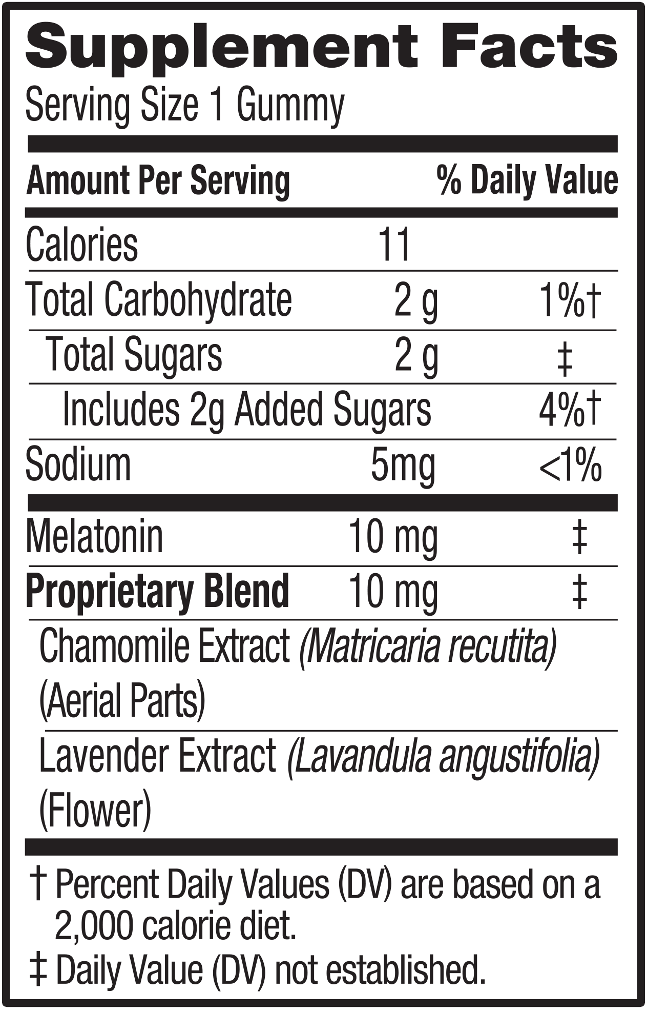 Melatonin & natural botanicals: Melatonin helps activate your natural sleep-wake cycle; chamomile calms and promotes restful sleep; and lavender encourages a relaxing sleep*